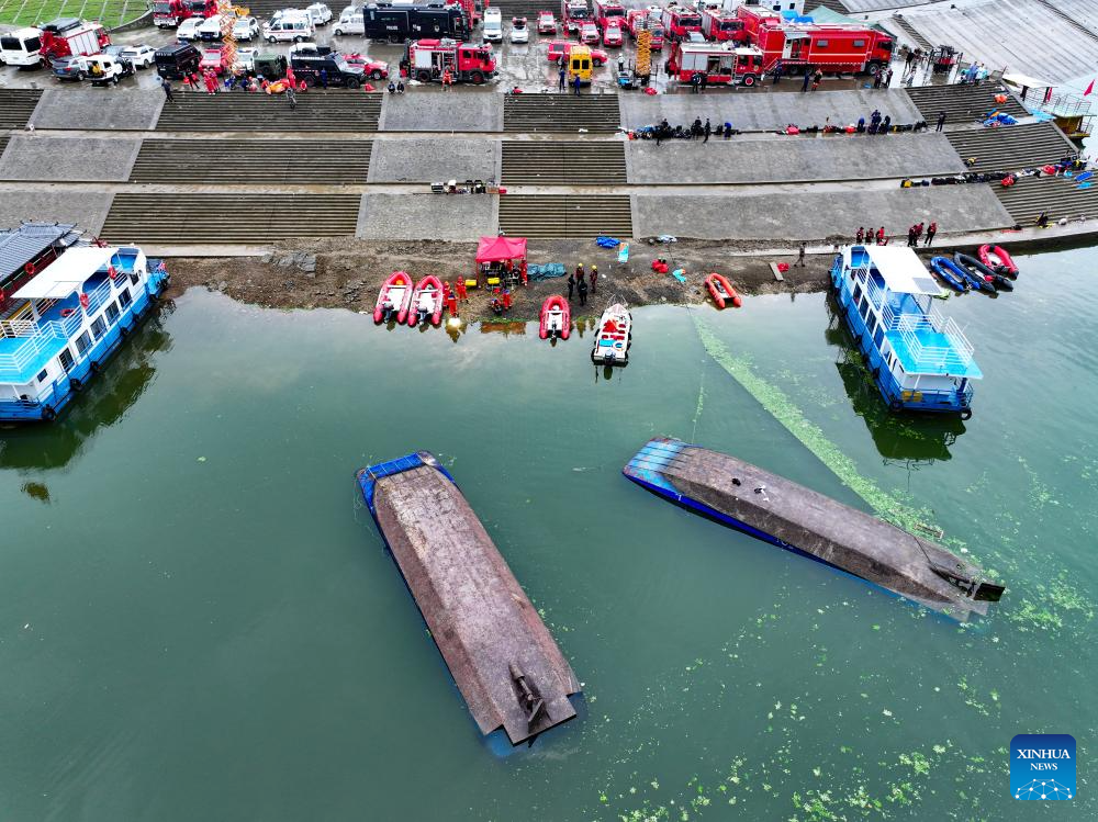 Four boats capsized in sudden strong winds in a river of Qianxi City, southwest China's Guizhou Province on Sunday afternoon, plunging 84 individuals into the water. Provincial authorities have deployed nearly 500 emergency responders to coordinate rescue efforts. The aftermath handling of the accident is still proceeding. (Xinhua/Liu Xu)