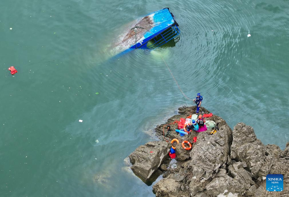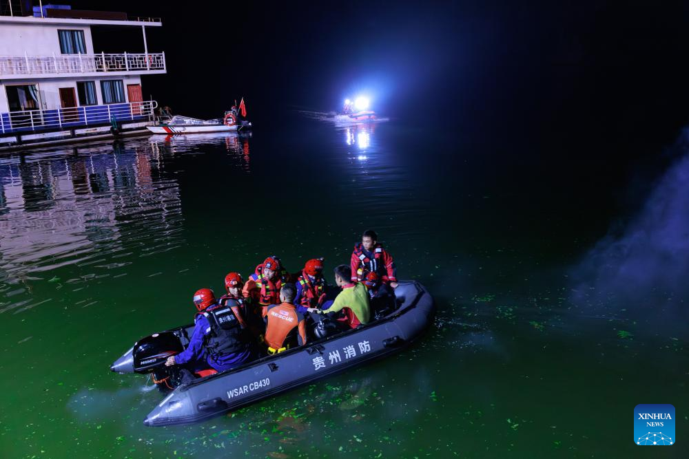 Rescuers carry out search and rescue operations after the boat capsize accident took place in Qianxi City, southwest China's Guizhou Province, May 5, 2025. Nine people died and one is missing in boat capsize accident in a river of Qianxi City, southwest China's Guizhou Province, on Sunday afternoon, according to local authorities.