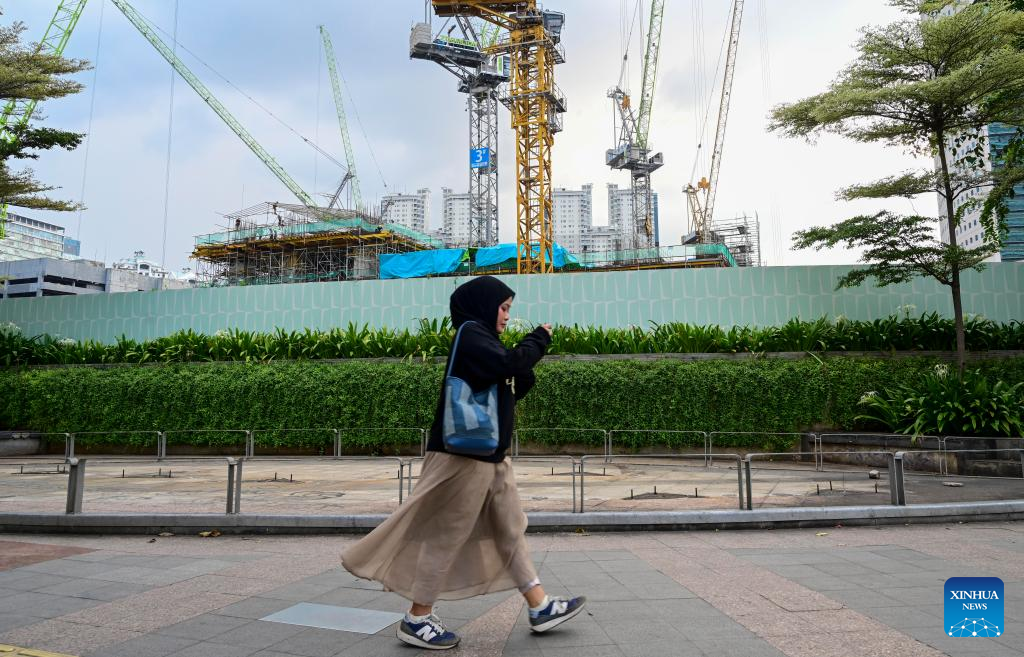 (250505) -- JAKARTA, May 5, 2025 (Xinhua) -- A pedestrian walks past a construction site in Jakarta, Indonesia, May 5, 2025. Indonesia posted an economic growth rate of 4.87 percent year-on-year in the first quarter of 2025, according to data released by the Central Statistics Agency (BPS) on Monday. (Xinhua/Zulkarnain)