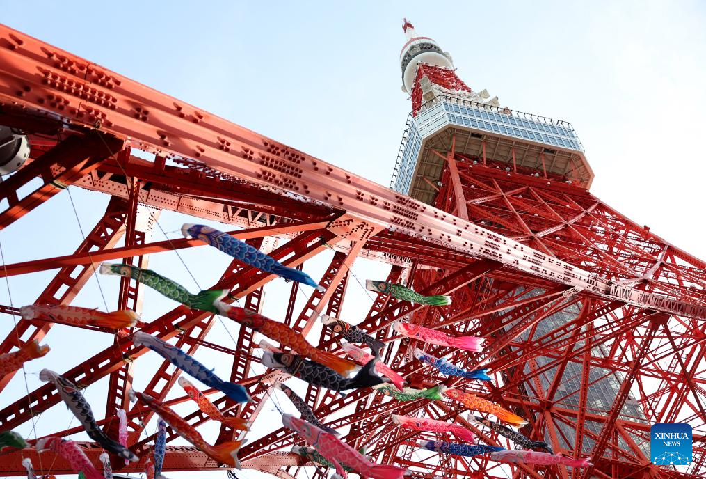 Traditional carp-shaped windsocks called "Koinobori", a symbol of good health and strength for children, are hung up in celebration of the Children's day in Tokyo, Japan, May 5, 2025. (Xinhua/Jia Haocheng)
