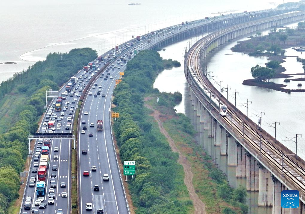 An aerial drone photo taken on May 5, 2025 shows vehicles running on a section of Shanghai-Wuhan expressway in Changzhou, east China's Jiangsu Province. On the last day of the May Day holiday, a peak in return trips was observed nationwide. (Photo by Chen Wei/Xinhua)