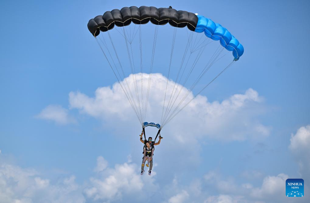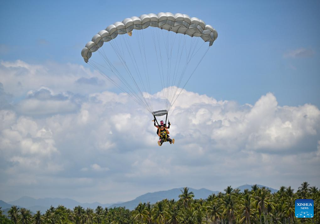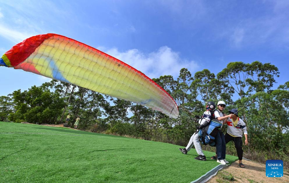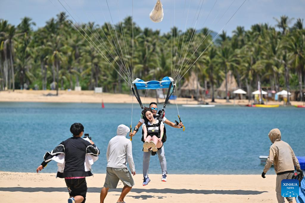 A tourist tries parachuting in Sanya, south China's Hainan Province, May 2, 2025. Low-altitude tourism activities such as paragliding and parachuting have become trendy among tourists to China's island province of Hainan during the May Day holiday. (Xinhua/Guo Cheng)