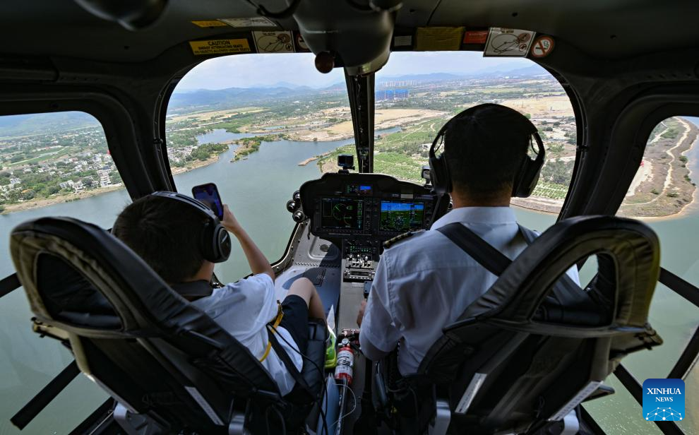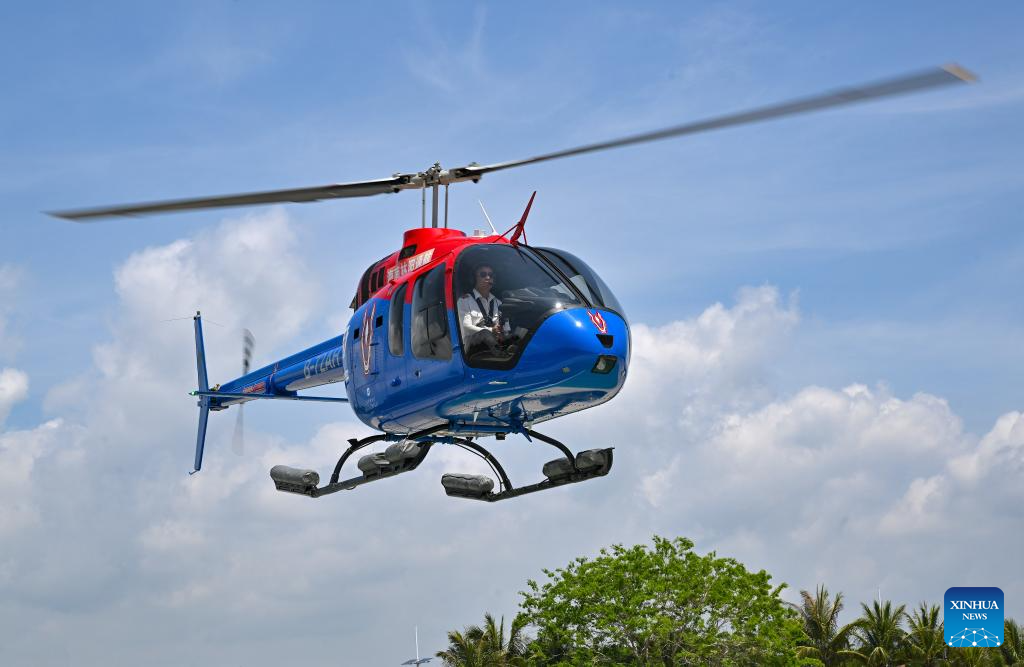 Tourists enjoy a helicopter sightseeing tour in Sanya, south China's Hainan Province, May 3, 2025. Low-altitude tourism activities such as paragliding and parachuting have become trendy among tourists to China's island province of Hainan during the May Day holiday. (Xinhua/Guo Cheng)