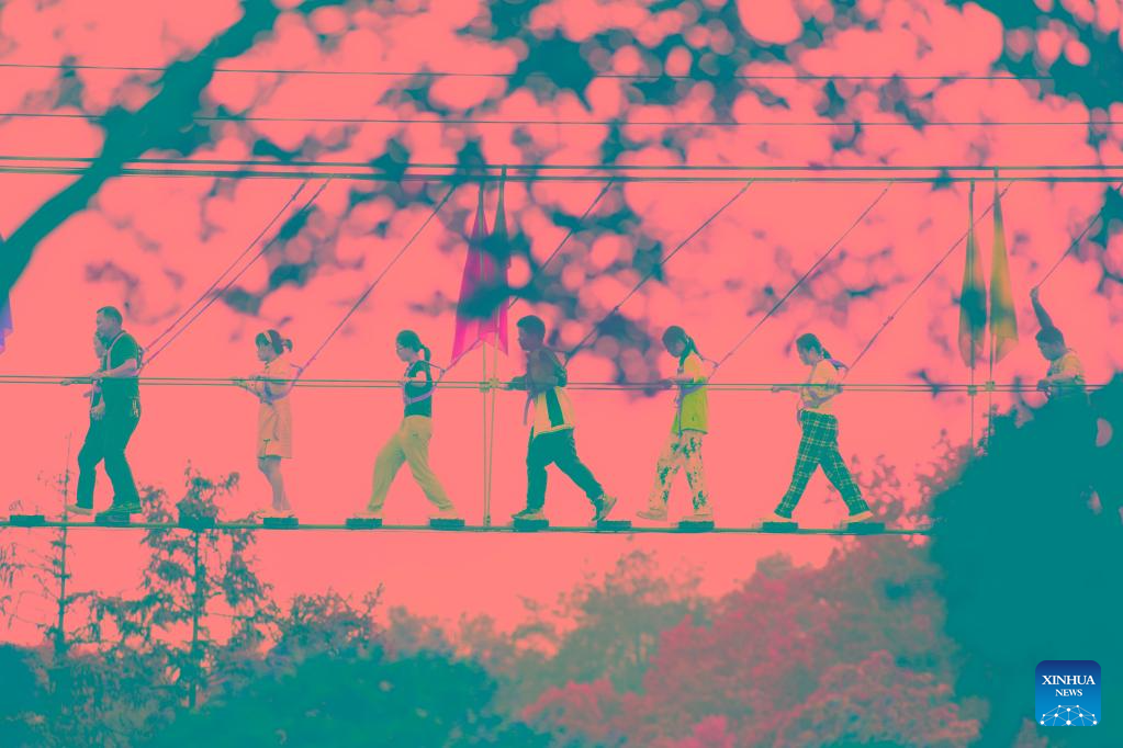 Tourists enjoy themselves at a scenic spot in Baise, south China's Guangxi Zhuang Autonomous Region, May 3, 2025. People across China enjoy the ongoing May Day holiday in various ways. (Photo by Miao Yucai/Xinhua)