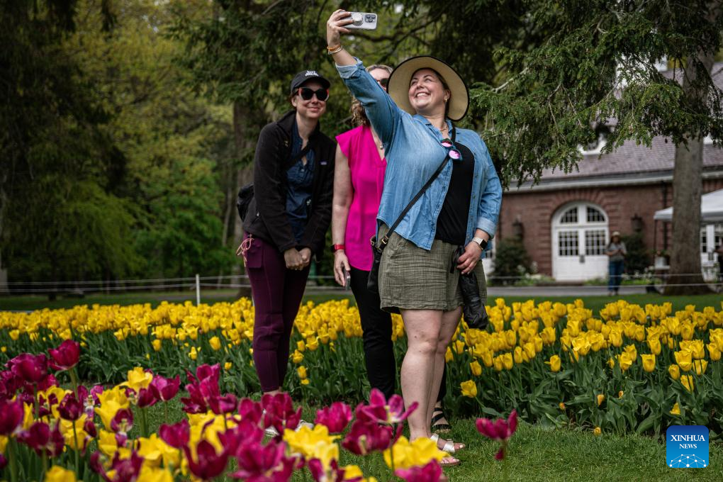 Visitors pose for selfies at the third annual Tulips Mania in Wellesley, Massachusetts, the United States, on May 4, 2025. More than 75,000 tulips were displayed for this event. (Photo by Ziyu Julian Zhu/Xinhua)