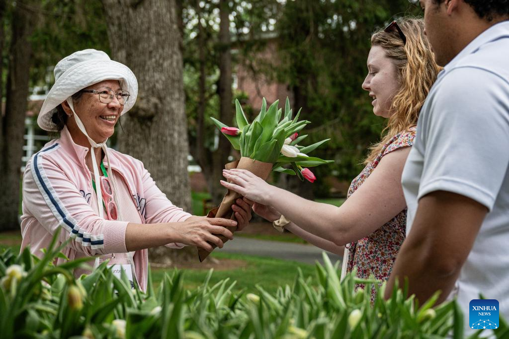 A volunteer helps pack up tulips for visitors at the third annual Tulips Mania in Wellesley, Massachusetts, the United States, on May 4, 2025. More than 75,000 tulips were displayed for this event. (Photo by Ziyu Julian Zhu/Xinhua)