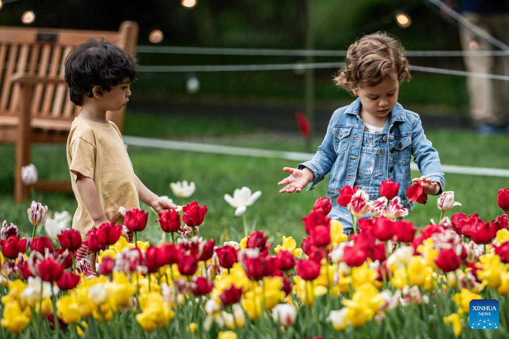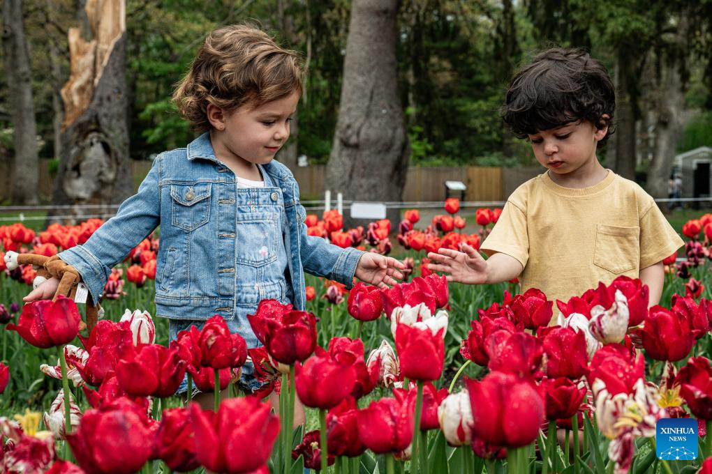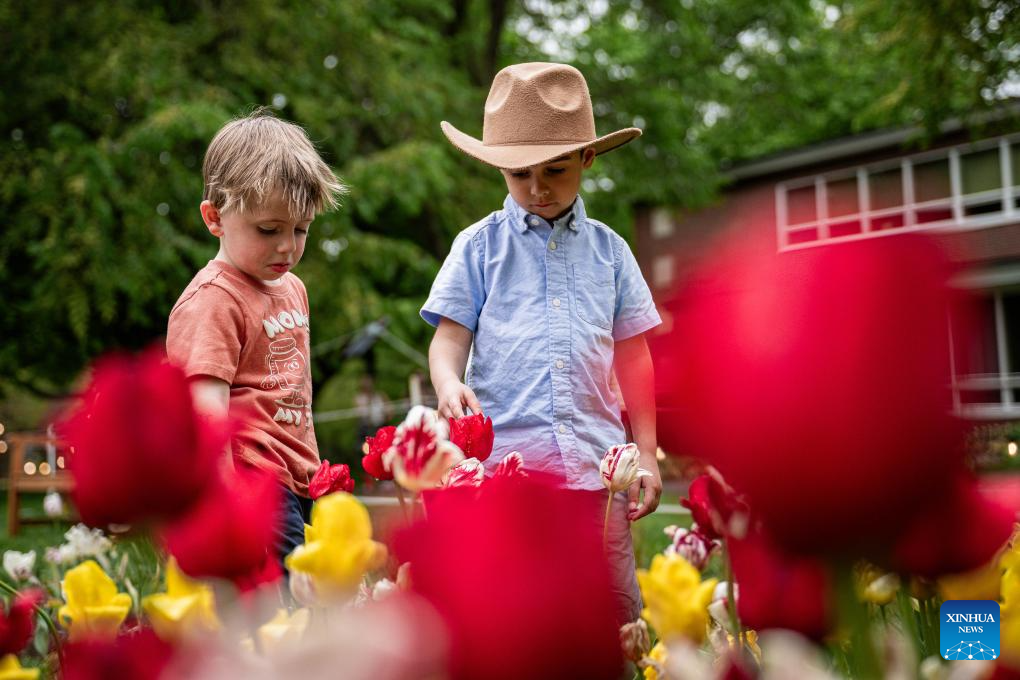 Kids look at tulips at the third annual Tulips Mania in Wellesley, Massachusetts, the United States, on May 4, 2025. More than 75,000 tulips were displayed for this event. (Photo by Ziyu Julian Zhu/Xinhua)