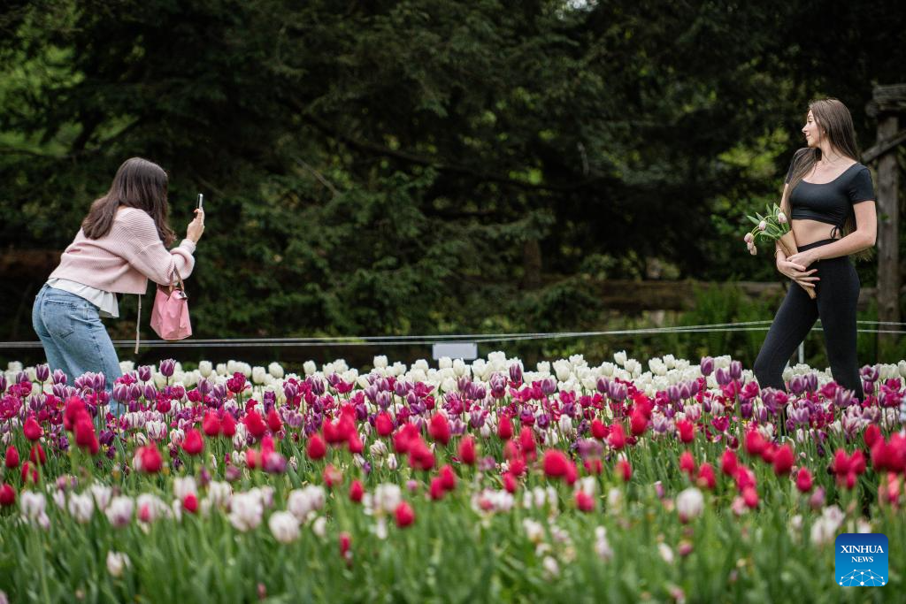 Visitors look at tulips at the third annual Tulips Mania in Wellesley, Massachusetts, the United States, on May 4, 2025. More than 75,000 tulips were displayed for this event. (Photo by Ziyu Julian Zhu/Xinhua)