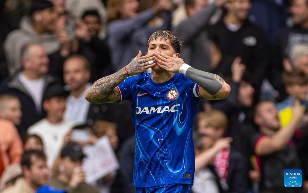 Chelsea's Enzo Fernandez celebrates after scoring the first goal during the English Premier League match between Chelsea FC and Liverpool FC in London, Britain, May 4, 2025. (Xinhua)