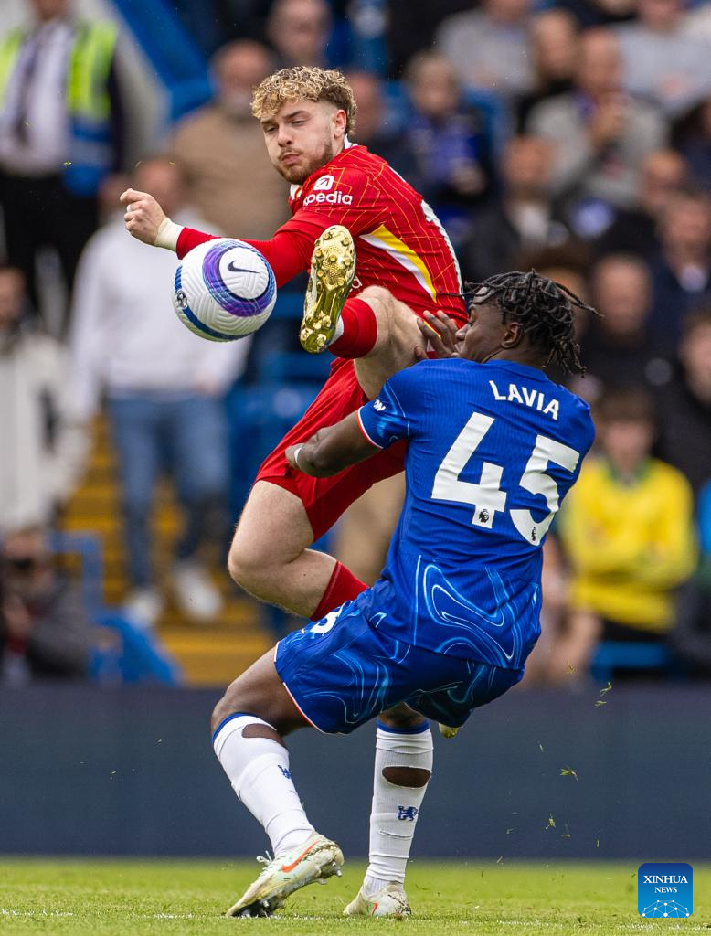 Liverpool's Harvey Elliott (L) is challenged by Chelsea's Romeo Lavia during the English Premier League match between Chelsea FC and Liverpool FC in London, Britain, May 4, 2025. (Xinhua)