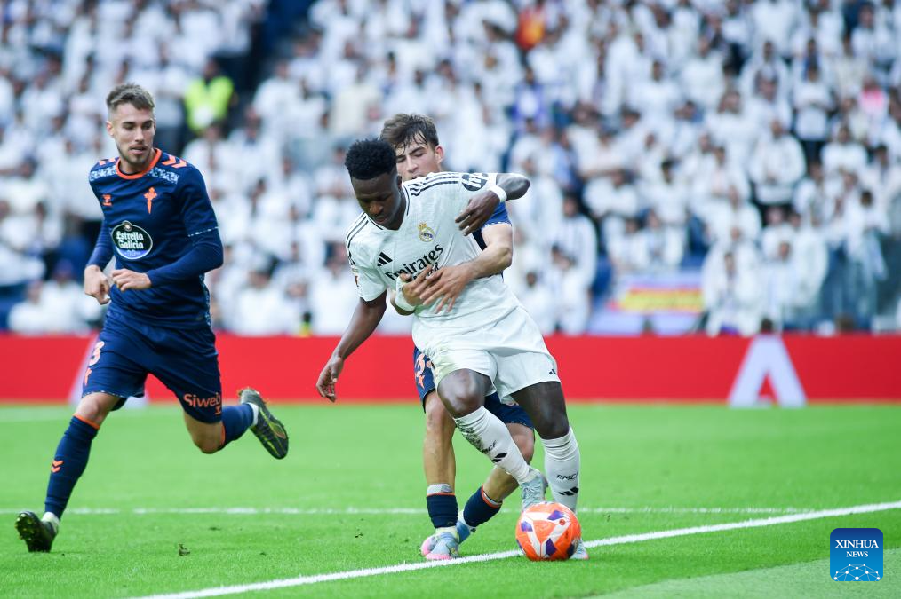 Vinicius Junior (front) of Real Madrid vies with Javi Rodriguez of RC Celta during the Laliga football match between Real Madrid and RC Celta in Santiago Bernabeu Stadium, Madrid, Spain, on May 4, 2025. (Photo by Gustavo Valiente/Xinhua)