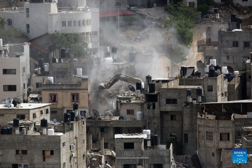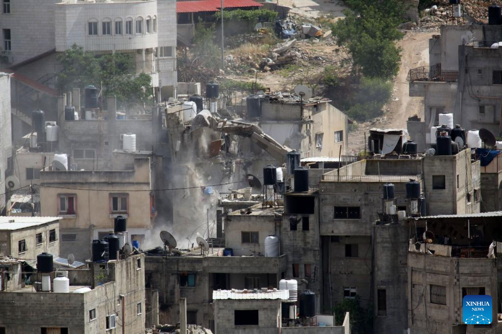 An Israeli excavator demolishes a Palestinian house in the Nur Shams refugee camp, east of Tulkarm, northern West Bank, on May 5, 2025. (Photo by Nidal Eshtayeh/Xinhua)