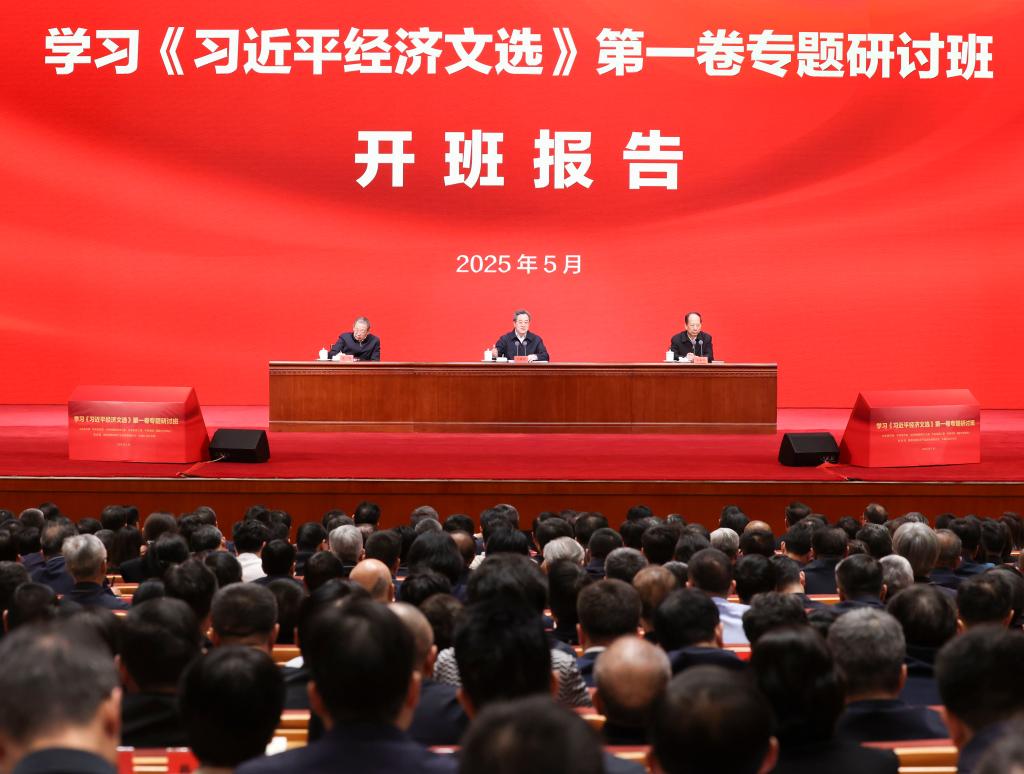 Chinese Vice Premier Ding Xuexiang, also a member of the Standing Committee of the Political Bureau of the Communist Party of China Central Committee, addresses the opening of a symposium to study the first volume of selected works of Xi Jinping on economy, May 6, 2025. (Xinhua/Pang Xinglei)