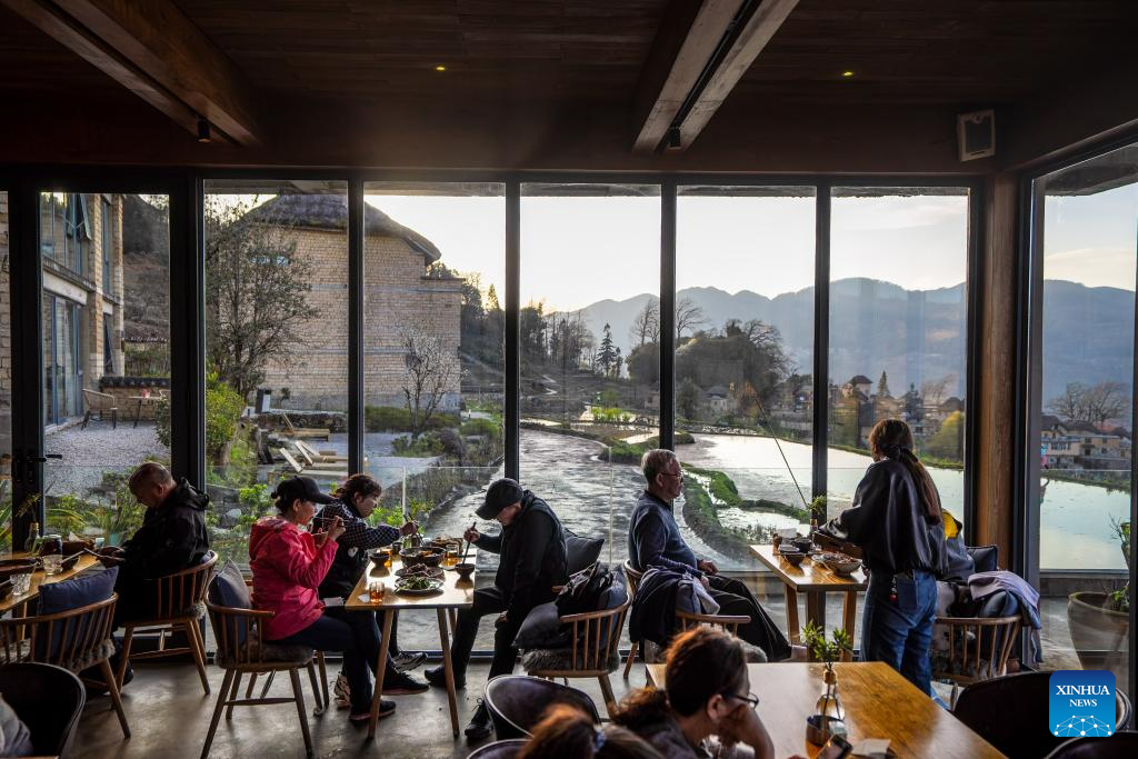 Tourists have dinner at a restaurant of a homestay in Azheke Village of Yuanyang County of Honghe Hani and Yi Autonomous Prefecture, southwest China's Yunnan Province, Feb. 27, 2025. (Xinhua/Hu Chao)