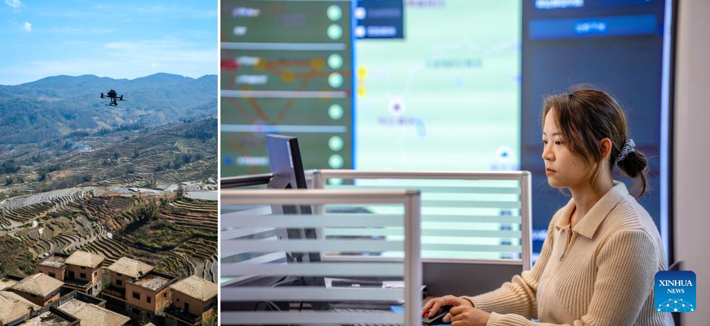 This combo photo shows a drone conducting patrol missions (L, drone photo), and a staff member of the Honghe Hani Rice Terraces world heritage management bureau operating drones to carry out patrol missions (R), in Yuanyang County of Honghe Hani and Yi Autonomous Prefecture, southwest China's Yunnan Province, Feb. 28, 2025. (Xinhua/Hu Chao)