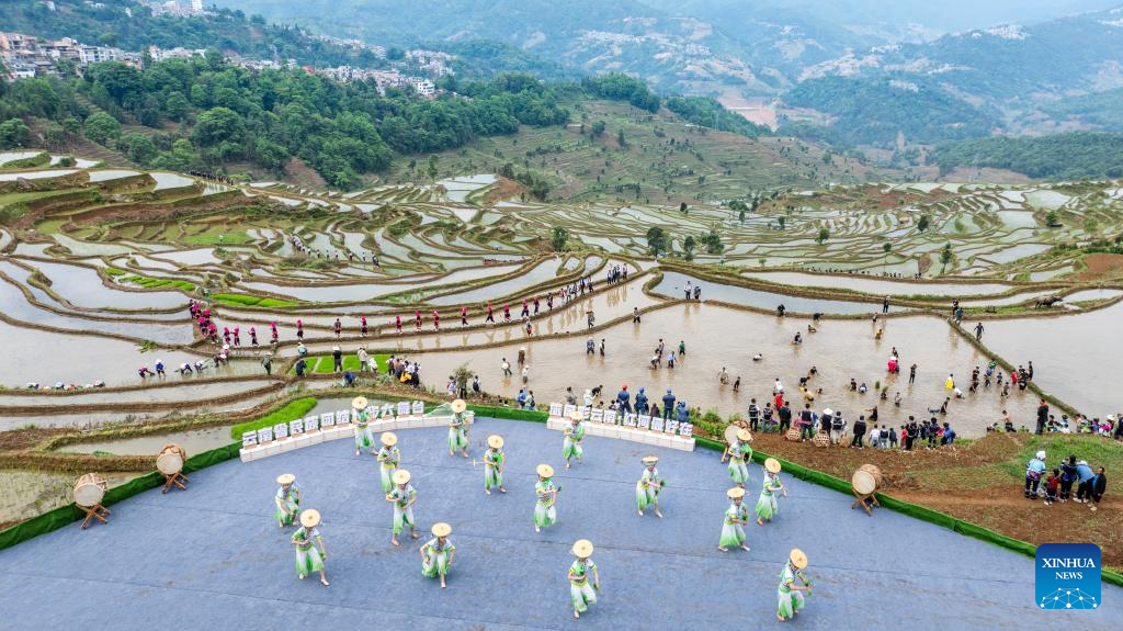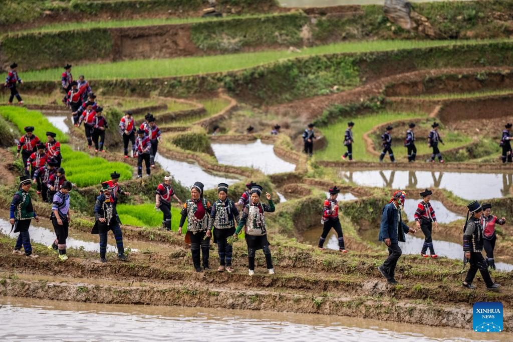 Villagers perform during an event marking the beginning of rice planting in the terraced fields in Jiayin Village of Honghe County of Honghe Hani and Yi Autonomous Prefecture, southwest China's Yunnan Province, May 2, 2025. (Xinhua/Hu Chao)