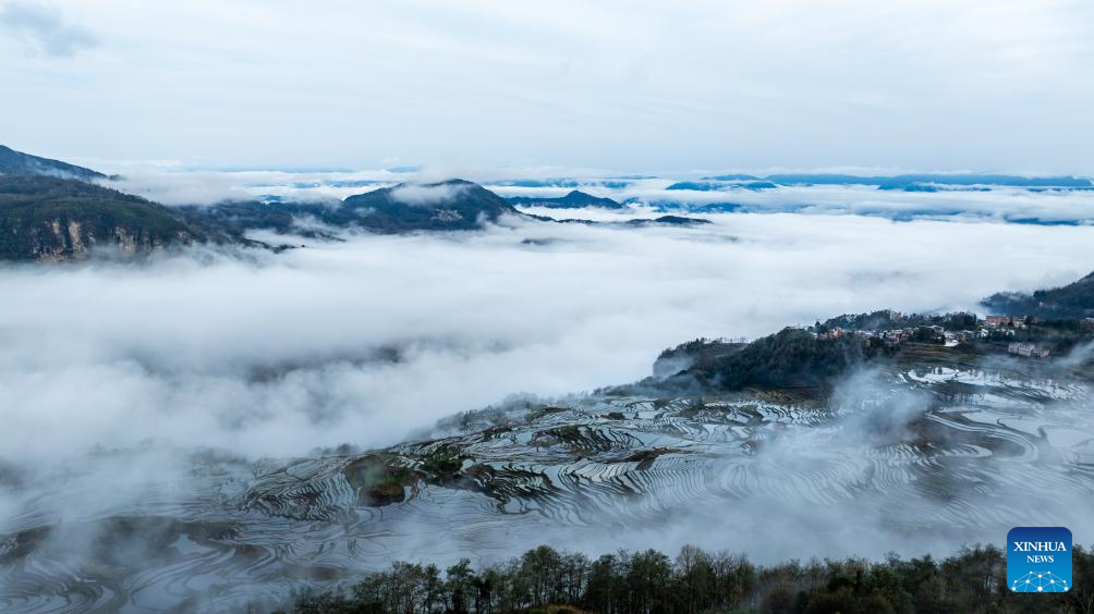 An aerial drone photo taken on Feb. 26, 2025 shows a view of the terraced fields in Azheke Village of Yuanyang County of Honghe Hani and Yi Autonomous Prefecture, southwest China's Yunnan Province. (Xinhua/Hu Chao)