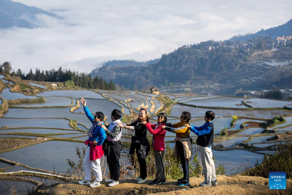 Tourists pose for photos at the terraced fields in Azheke Village of Yuanyang County of Honghe Hani and Yi Autonomous Prefecture, southwest China's Yunnan Province, Feb. 28, 2025. Rice cultivation, fish farming, and duck raising -- all in the awe-inspiring terraces. It is a way of life that weaves a story of ecological harmony, traditional wisdom, and modern innovation.