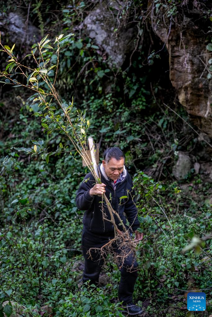 A forest ranger goes to the mountains to plant trees in Azheke Village of Yuanyang County of Honghe Hani and Yi Autonomous Prefecture, southwest China's Yunnan Province, Feb. 27, 2025. (Xinhua/Hu Chao)