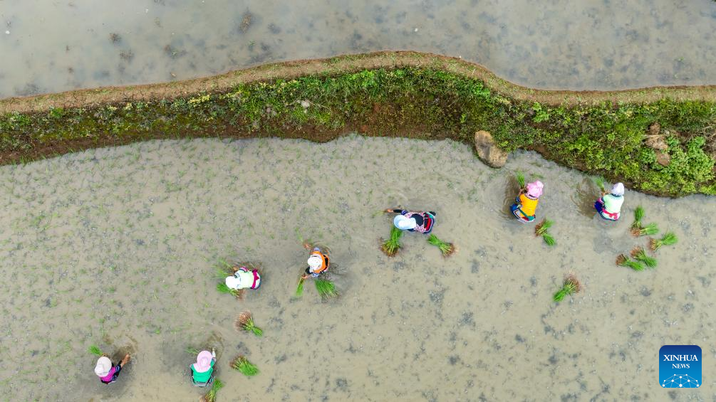 An aerial drone photo taken on May 2, 2025 shows villagers transplanting rice seedlings in the terraced fields in Jiayin Village of Honghe County of Honghe Hani and Yi Autonomous Prefecture, southwest China's Yunnan Province. (Xinhua/Hu Chao)