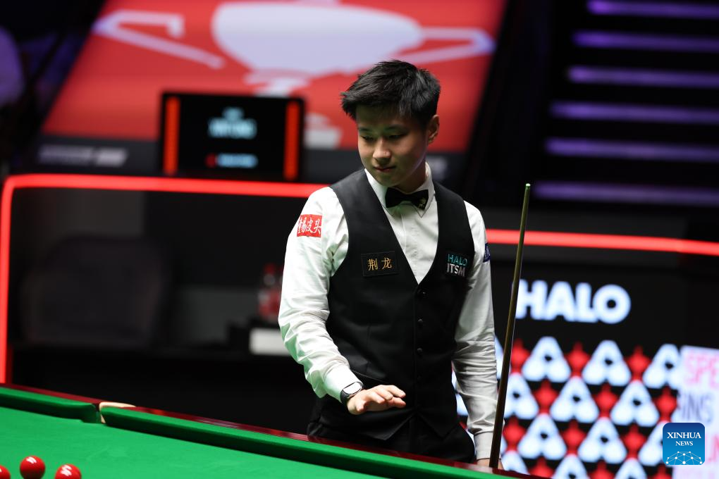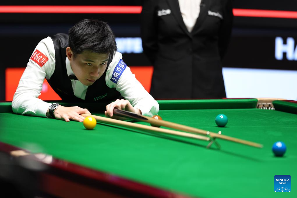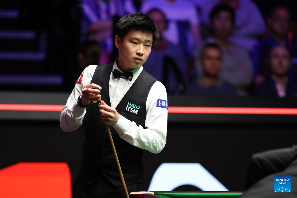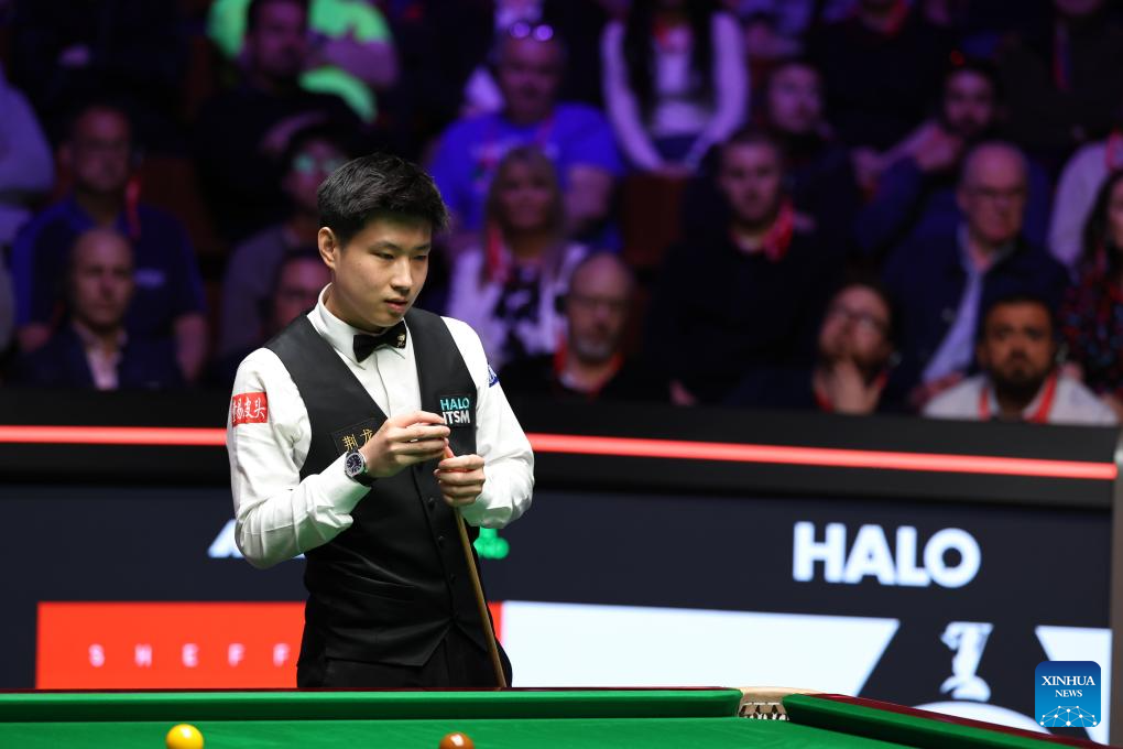 Zhao Xintong competes during the final between Zhao Xintong of China and Mark Williams of Wales at World Snooker Championship 2025 in Sheffield, Britain, May 5, 2025. (Photo by Zhai Zheng/Xinhua)
