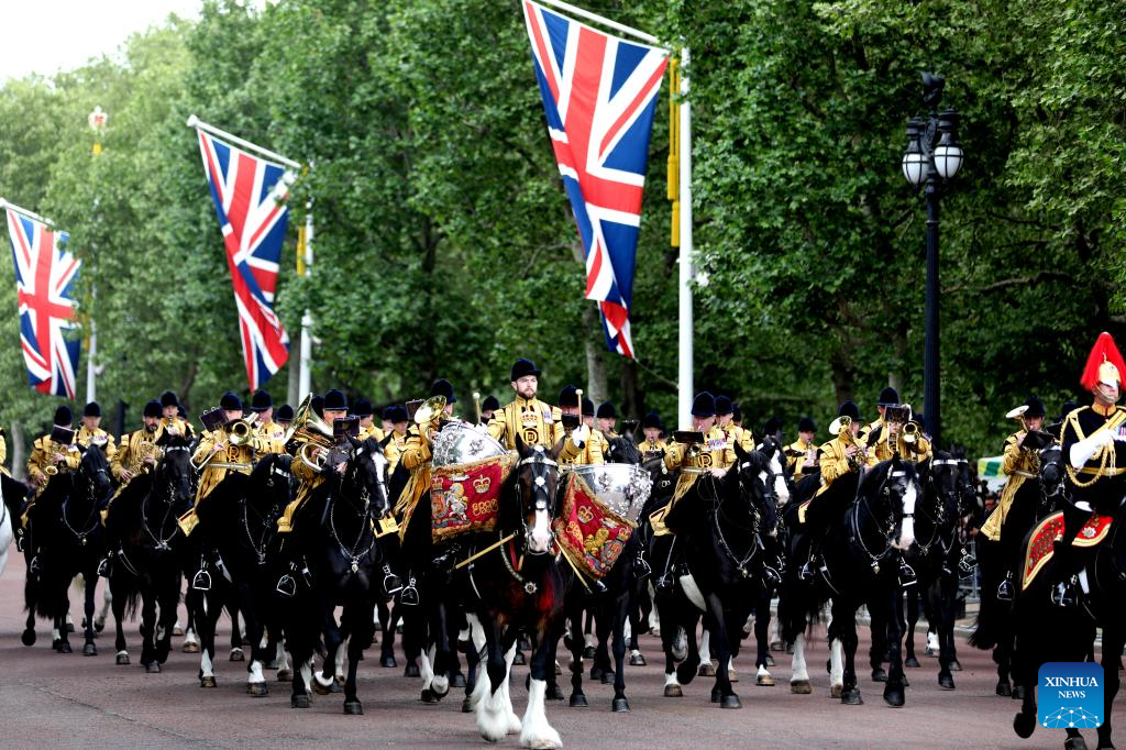 Britain's King Charles III (2nd R, front) attends the military procession held in London, Britain, on May 5, 2025. Britain held military processions and a Royal Air Force flypast on Monday to commemorate the 80th anniversary of Victory in Europe (VE) Day. (Xinhua/Li Ying)
