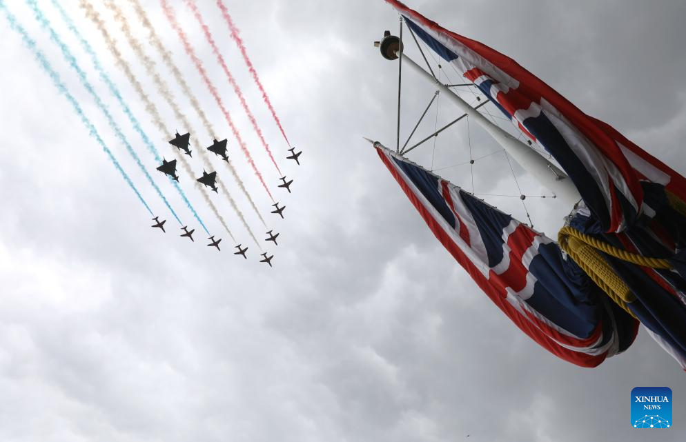 Planes fly in formation in London, Britain, on May 5, 2025. Britain held military processions and a Royal Air Force flypast on Monday to commemorate the 80th anniversary of Victory in Europe (VE) Day. (Xinhua/Li Ying)