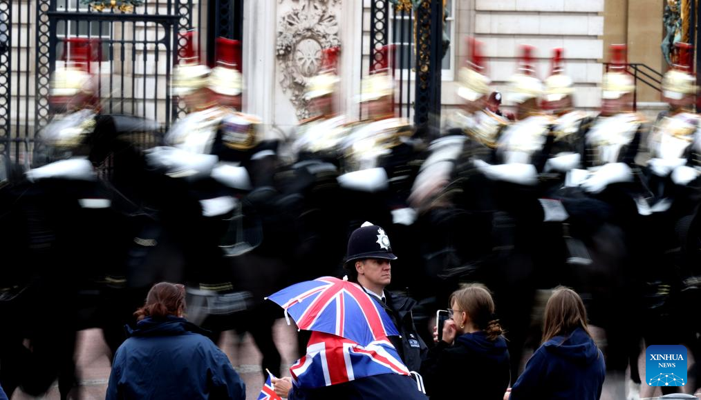 Members of the armed forces for the military procession pass Buckingham Palace in London, Britain, on May 5, 2025. Britain held military processions and a Royal Air Force flypast on Monday to commemorate the 80th anniversary of Victory in Europe (VE) Day. (Xinhua/Li Ying)