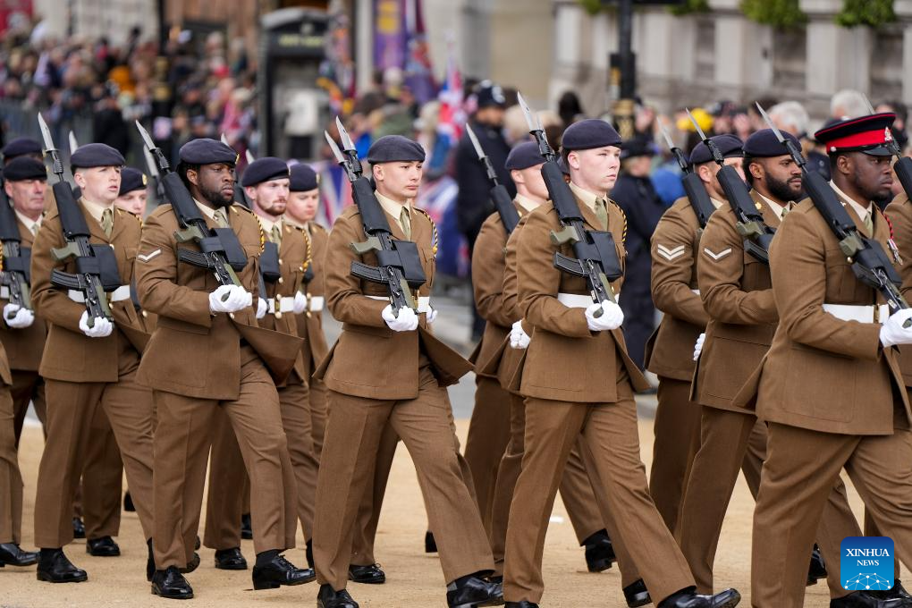 Members of the armed forces participate in the military procession held in London, Britain, on May 5, 2025. Britain held military processions and a Royal Air Force flypast on Monday to commemorate the 80th anniversary of Victory in Europe (VE) Day. (Xinhua/Wu Lu)