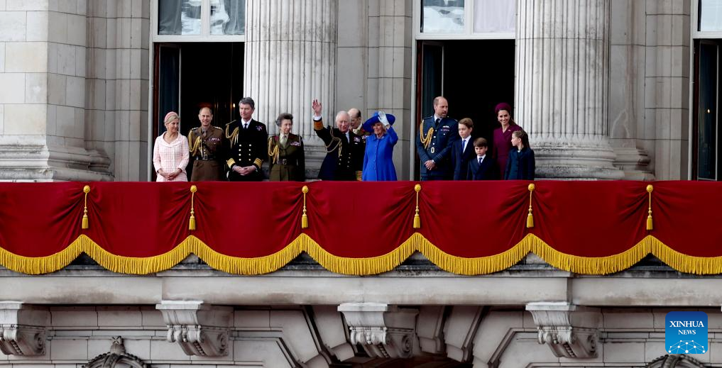 Britain's King Charles III and Queen Camilla wave on the balcony of Buckingham Palace in London, Britain on May 5, 2025. Britain held military processions and a Royal Air Force flypast on Monday to commemorate the 80th anniversary of Victory in Europe (VE) Day. (Xinhua/Li Ying)