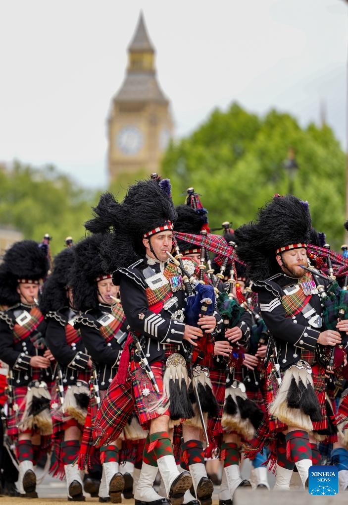 Bagpipers participate in the military procession held in London, Britain, on May 5, 2025. Britain held military processions and a Royal Air Force flypast on Monday to commemorate the 80th anniversary of Victory in Europe (VE) Day. (Xinhua/Wu Lu)