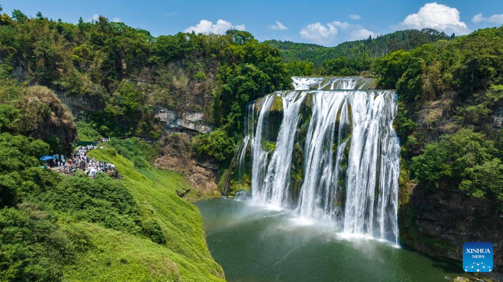 An aerial drone photo taken on May 4, 2025 shows the Huangguoshu Scenic Area in Anshun City, southwest China's Guizhou Province, May 4, 2025. During the five-day May Day holiday, Chinese travelers took an estimated 314 million domestic trips, marking a 6.4 percent increase from the previous year, according to figures released by the Ministry of Culture and Tourism.