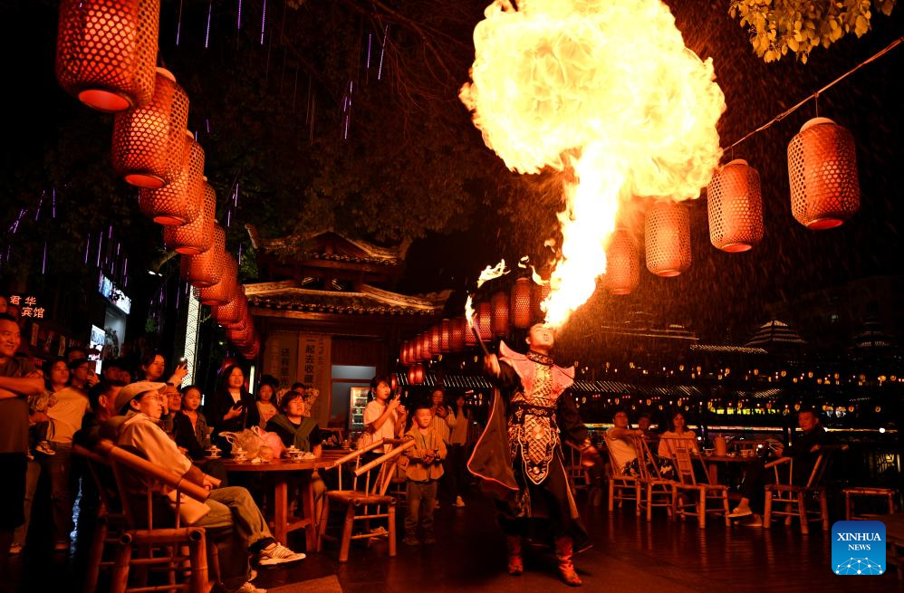Tourists watch a fire-spitting performance along Gongshui River in Xuan'en County, central China's Hubei Province, May 4, 2025.