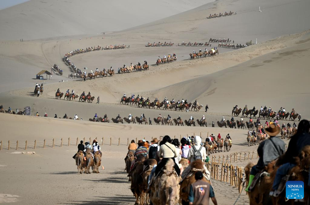 Tourists visit Mingsha Mountain and Crescent Spring scenic spot in Dunhuang, northwest China's Gansu Province, May 4, 2025.