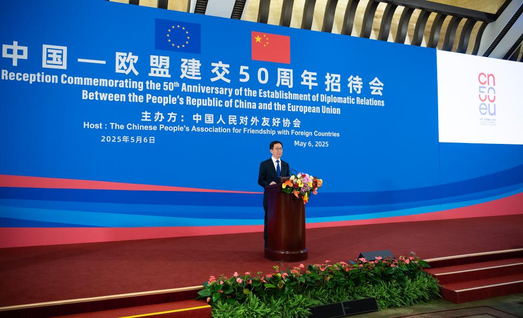 Chinese Vice President Han Zheng addresses a reception celebrating the 50th anniversary of diplomatic ties between China and the European Union (EU) in Beijing, capital of China, May 6, 2025. (Xinhua/Li Tao)