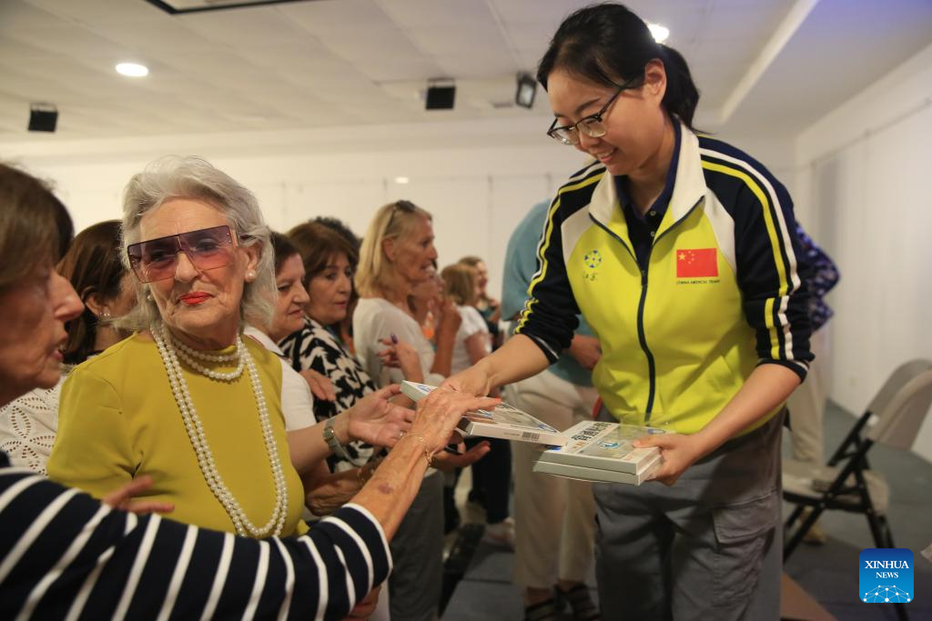 Zhou Wenting (1st R), a member of the 20th Chinese medical team for Malta, distributes medicinal plasters in Swieqi, Malta, on May 6, 2025. The 20th Chinese medical team from the Mediterranean Regional Centre for Traditional Chinese Medicine (MRCTCM) provided free clinical services to residents at the Swieqi Local Council in eastern Malta on Tuesday.