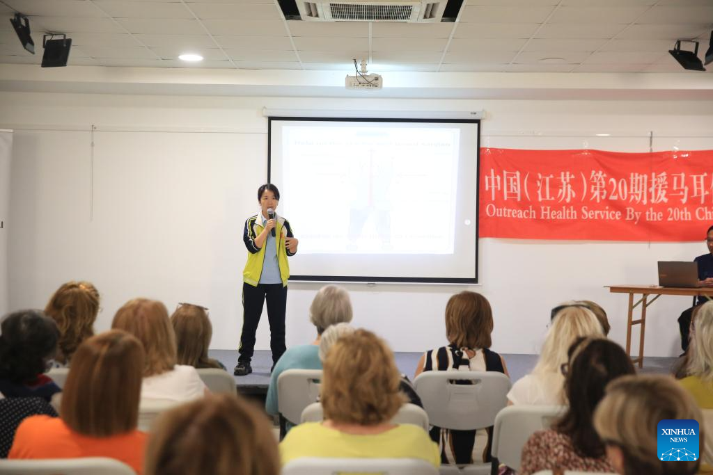 Tang Limei, a member of the 20th Chinese medical team for Malta, gives a lecture on Baduanjin, a traditional form of Chinese aerobic exercise known for its health benefits, in Swieqi, Malta, on May 6, 2025. The 20th Chinese medical team from the Mediterranean Regional Centre for Traditional Chinese Medicine (MRCTCM) provided free clinical services to residents at the Swieqi Local Council in eastern Malta on Tuesday.