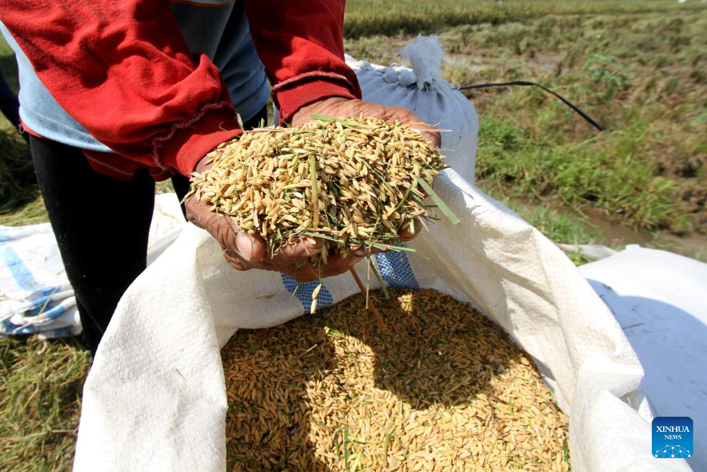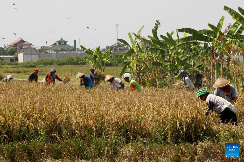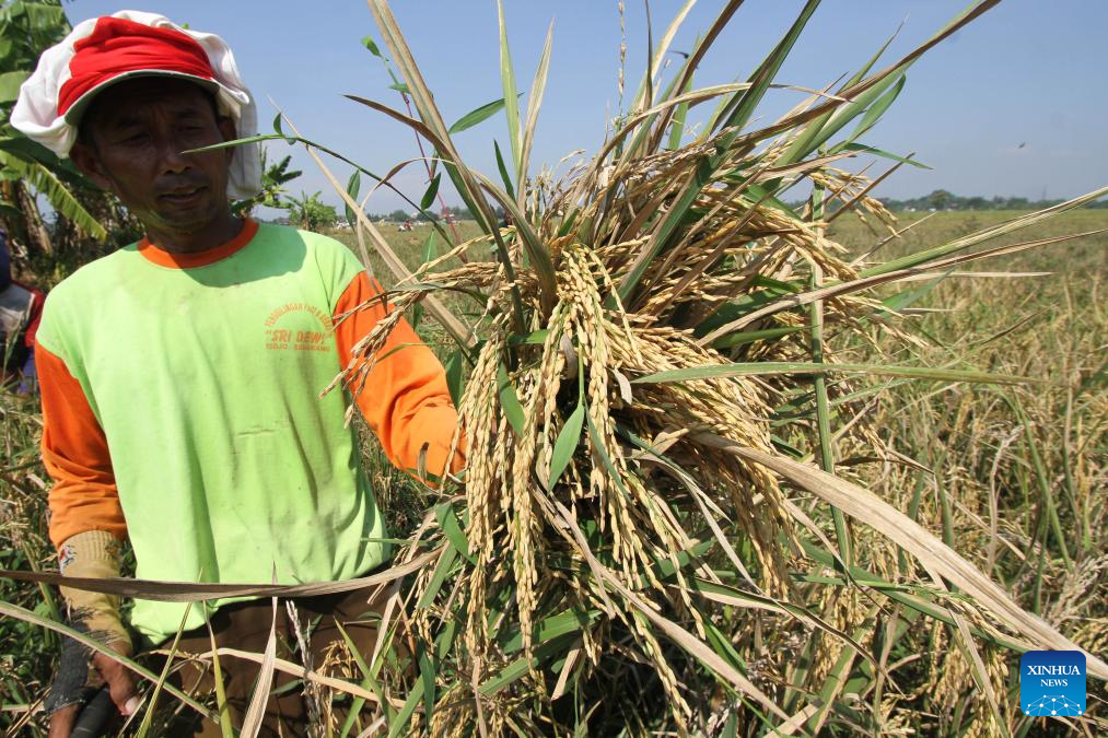Farmers harvest paddy at Demakan village in Sukoharjo Regency, Central Java, Indonesia, May 6, 2025. Indonesia's total rice production is expected to reach 18.76 million tons between January and June this year, marking a significant 11.17 percent increase compared to the same period last year, Central Statistics Agency (BPS) predicted on Friday. (Photo by Bram Selo/Xinhua)