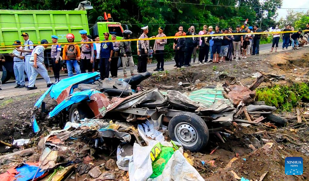 JAKARTA, May 7 (Xinhua) -- At least 11 people were killed and five others injured when a truck collided with a small bus in Indonesia's Central Java province on Wednesday, a senior rescue official said.