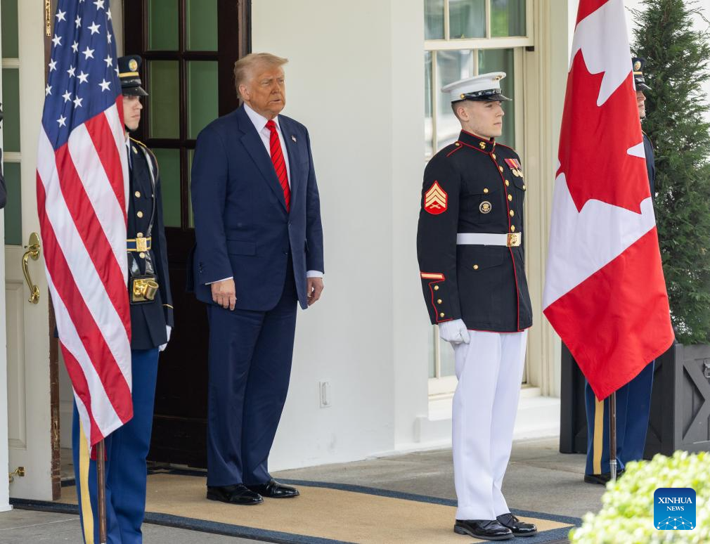 U.S. President Donald Trump (C) waits to welcome Canadian Prime Minister Mark Carney at the White House in Washington, D.C., the United States, on May 6, 2025. The United States will stop strikes against Yemen's Houthi group, President Donald Trump said Tuesday, after a nearly two-month bombing campaign. Trump, ahead of a meeting with Canadian Prime Minister Mark Carney, said the halt would start immediately, after the Houthis approached the administration on Monday night indicating "they want to stop the fighting." (Xinhua/Hu Yousong)