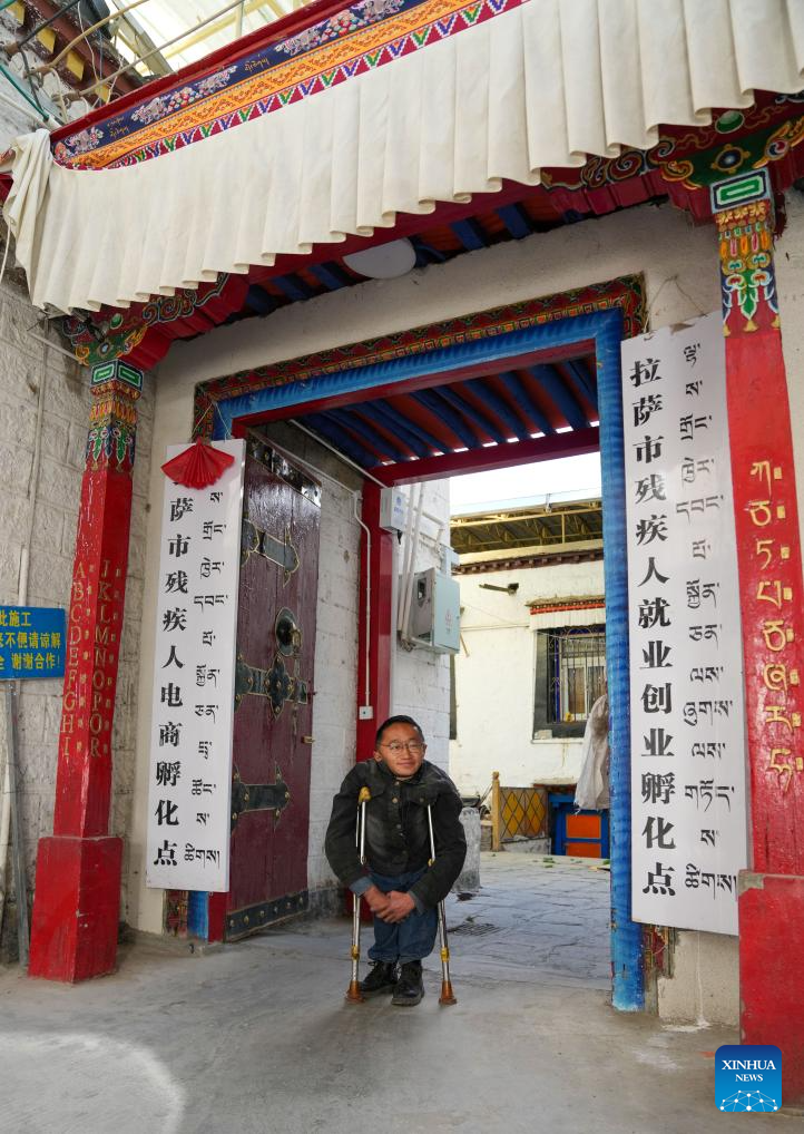 Lhapa Dondrup uploads product information to the internet at the company in Lhasa, southwest China's Xizang Autonomous Region, May 5, 2025. Lhapa Dondrup, a 24-year-old man born in Lhasa, has been suffering from osteogenesis imperfecta (OI), commonly known as brittle bone disease, since childhood. Now as an adult, he stands under one meter tall and relies on crutches and electric wheelchair for mobility. Despite these challenges, Lhapa harbors a dream of becoming a photographer.