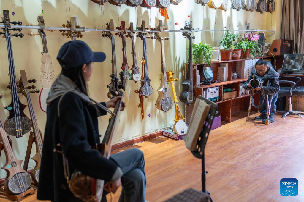 Lhapa Dondrup takes photos of the Zhanian, a traditional Tibetan stringed instrument, at the company in Lhasa, southwest China's Xizang Autonomous Region, May 6, 2025. Lhapa Dondrup, a 24-year-old man born in Lhasa, has been suffering from osteogenesis imperfecta (OI), commonly known as brittle bone disease, since childhood. Now as an adult, he stands under one meter tall and relies on crutches and electric wheelchair for mobility. Despite these challenges, Lhapa harbors a dream of becoming a photographer.