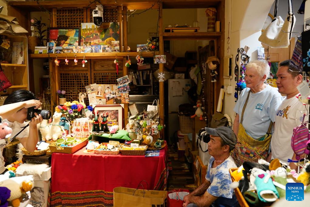 Rachel Grace Pinniger (4th L) bids farewell to her friend in front of Blue Sheep, a handicrafts shop, in Chengdu, southwest China's Sichuan Province, April 19, 2025. (Xinhua/Xu Bingjie)