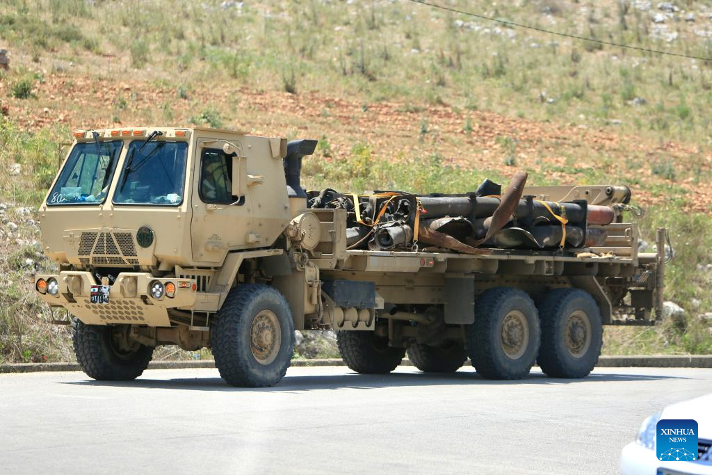 A Lebanese army truck carrying a destroyed Hezbollah missile platform is pictured in Kfar Tebnit, Upper Nabatieh, Lebanon, on May 8, 2025. Israeli warplanes carried out a series of intense airstrikes on Thursday on the outskirts of the city of Nabatieh in southern Lebanon, according to official and security sources.