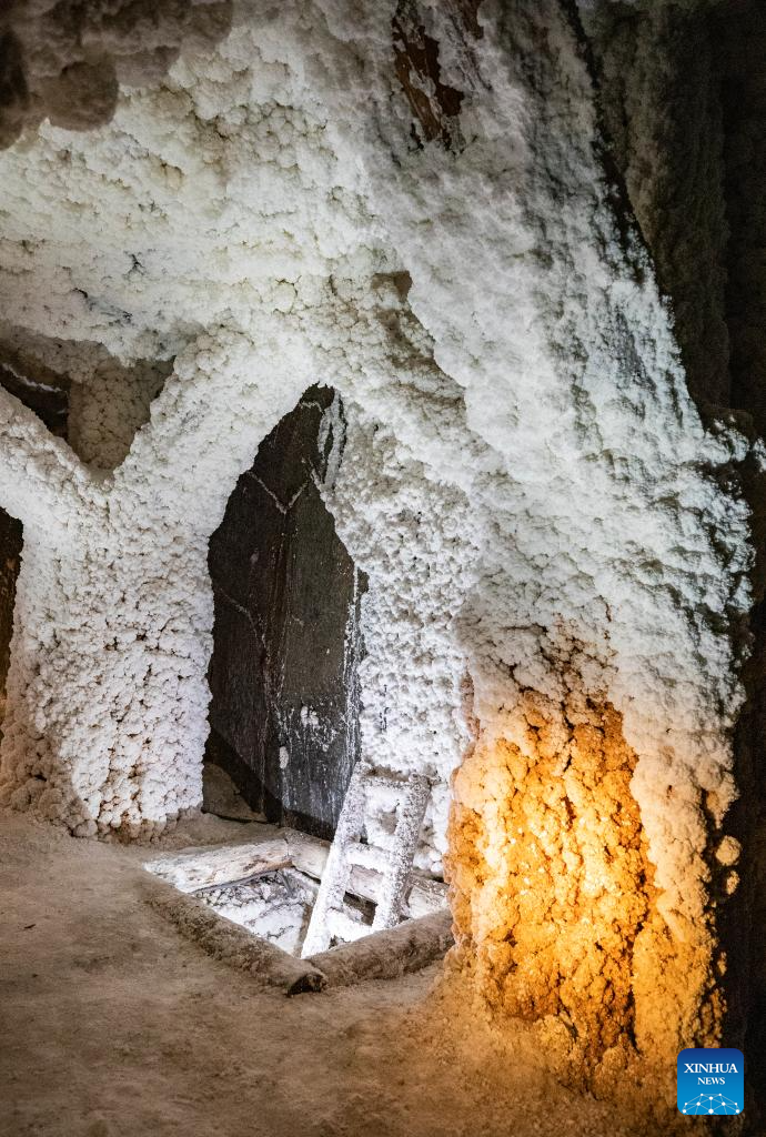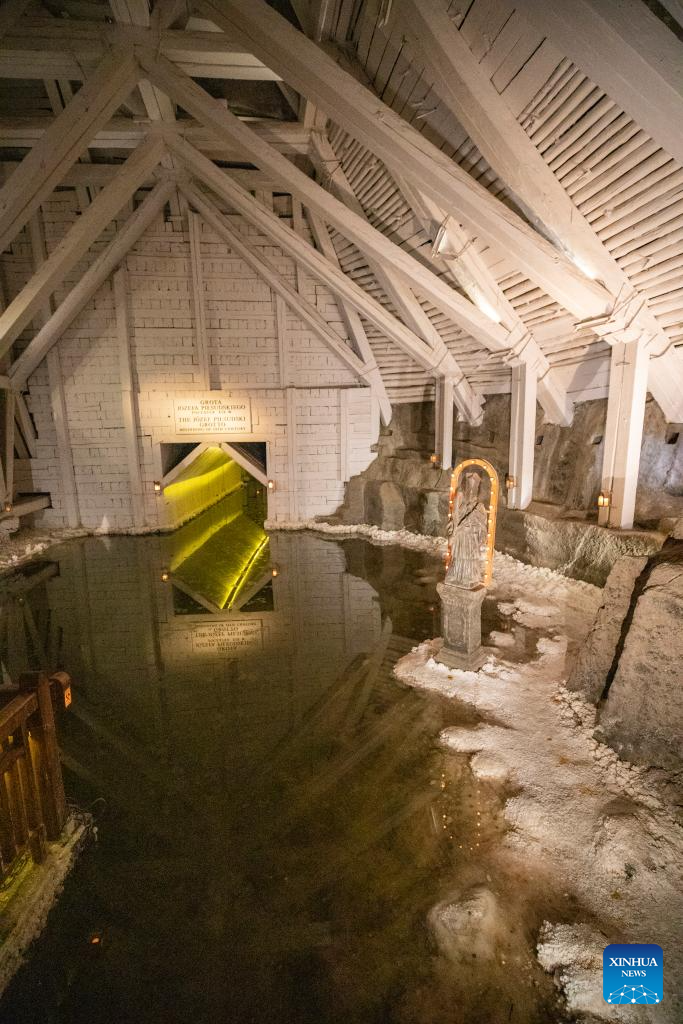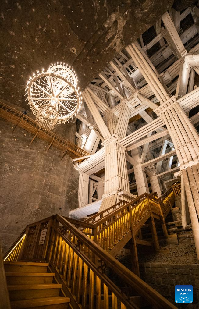 This photo taken on May 7, 2025 shows an interior view of the Wieliczka Salt Mine in Wieliczka, Poland. The deposit of rock salt in Wieliczka has been mined since the 13th century. This major industrial undertaking is the oldest of its type in Europe. The Wieliczka Salt Mine illustrates the historic stages of the development of mining techniques in Europe from the 13th to the 20th centuries: the mine has hundreds of kilometers of galleries with works of art, underground chapels and statues sculpted in the salt, making a fascinating pilgrimage into the past. The Wieliczka Salt Mine was included in the UNESCO World Heritage List in 1978. (Xinhua/Zhang Fan)