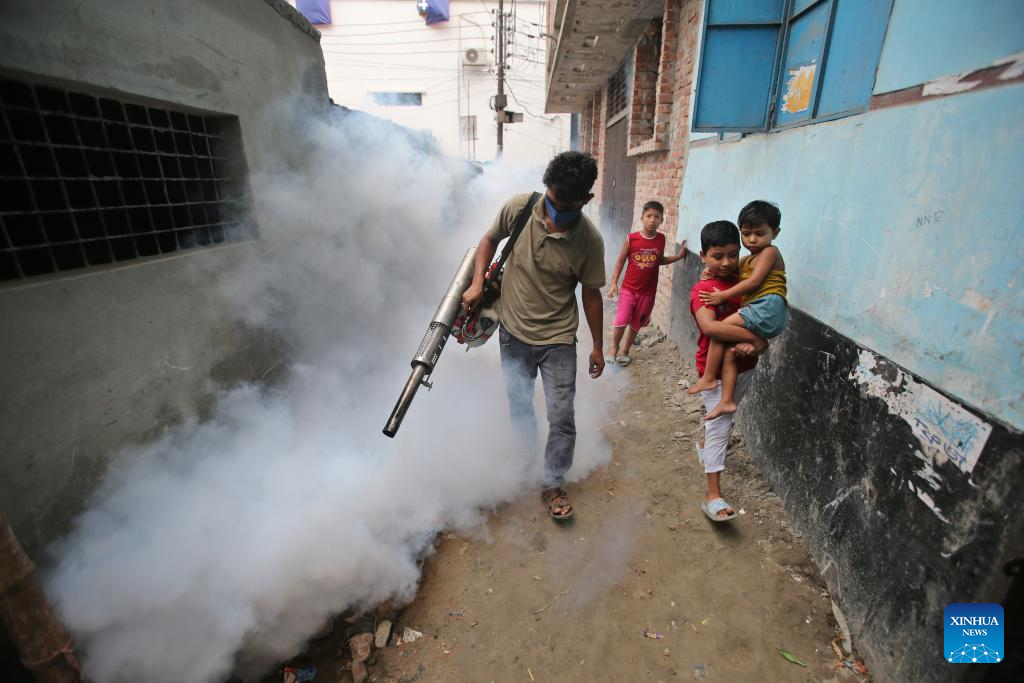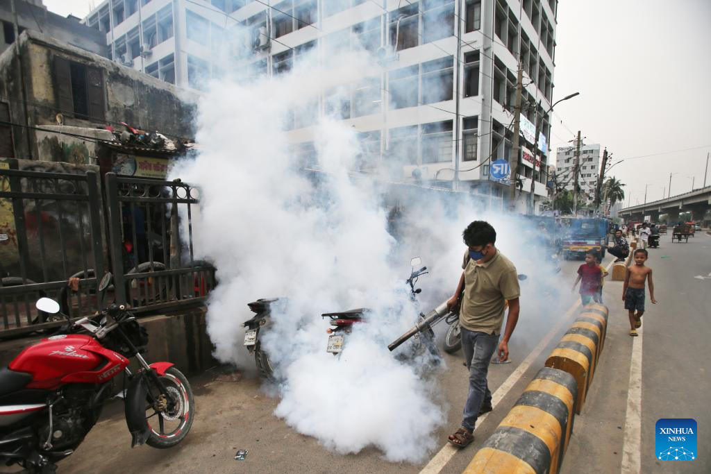 A worker sprays anti-mosquito materials to prevent the spread of dengue fever in Dhaka, Bangladesh, May 6, 2025. (Photo by Habibur Rahman/Xinhua)