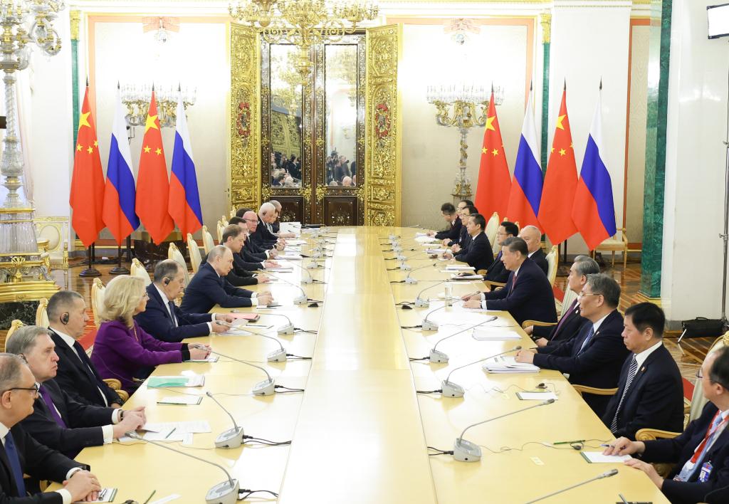 Chinese President Xi Jinping and Russian President Vladimir Putin hold large-group talks at the Kremlin in Moscow, Russia, May 8, 2025. Xi held talks here on Thursday with Putin. (Xinhua/Yao Dawei)