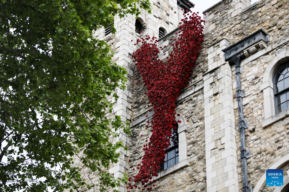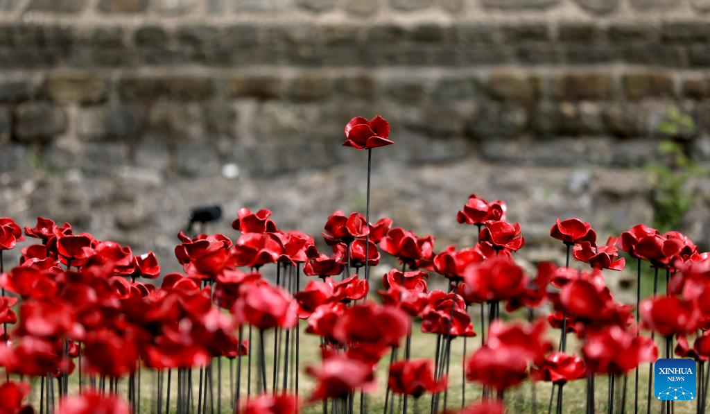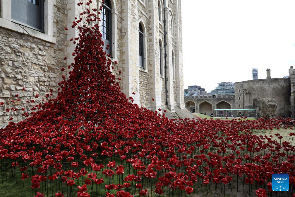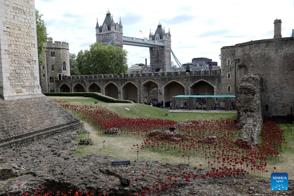 This photo taken on May 7, 2025 shows a view of ceramic poppies displayed at the Tower of London in London, Britain. An installation of nearly 30,000 ceramic poppies is on display from May 6 to Nov. 11 at the Tower of London, commemorating the 80th anniversary of the end of the Second World War. (Xinhua/Li Ying)
