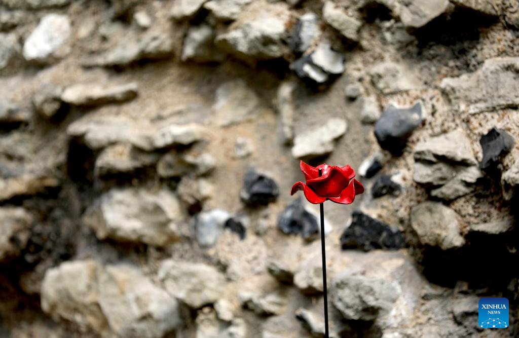 This photo taken on May 7, 2025 shows a ceramic poppy displayed at the Tower of London in London, Britain. An installation of nearly 30,000 ceramic poppies is on display from May 6 to Nov. 11 at the Tower of London, commemorating the 80th anniversary of the end of the Second World War. (Xinhua/Li Ying)