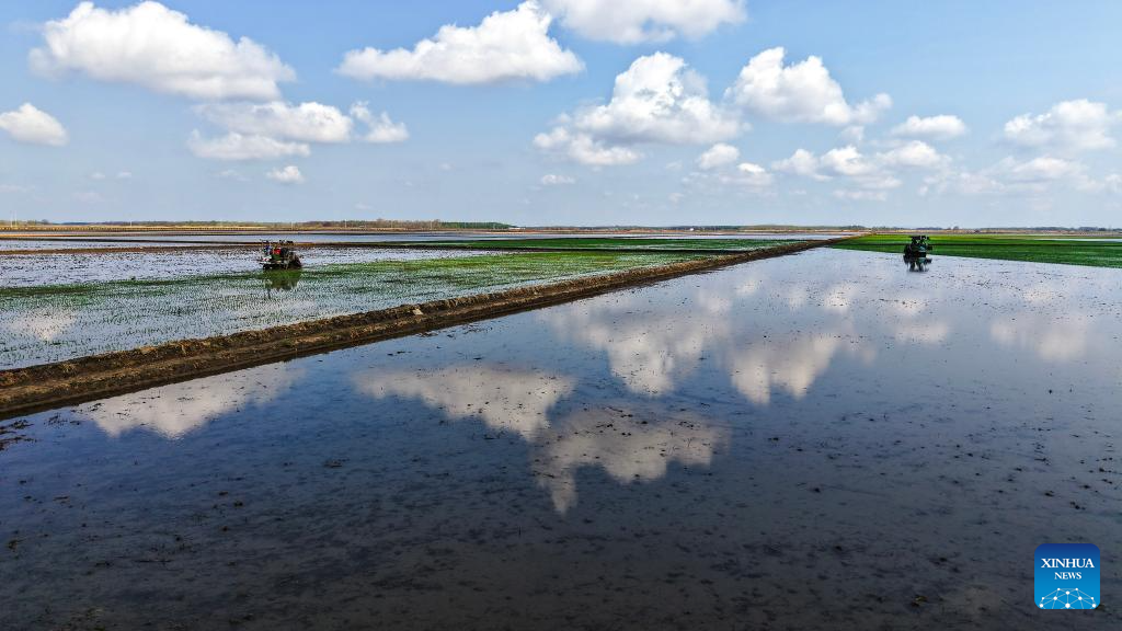 Farmers operate high-speed transplanters powered by the Beidou satellite navigation system in a paddy rice field of a farm of Beidahuang Group in northeast China's Heilongjiang Province, May 8, 2025. At present, the spring sowing in Heilongjiang cultivation areas are in full swing. All agricultural production units of Beidahuang Group, one of China's leading agricultural conglomerates, are seizing the farming season and busy with the sowing operations in both paddy rice fields and dry fields. (Photo by Li Xing/Xinhua)